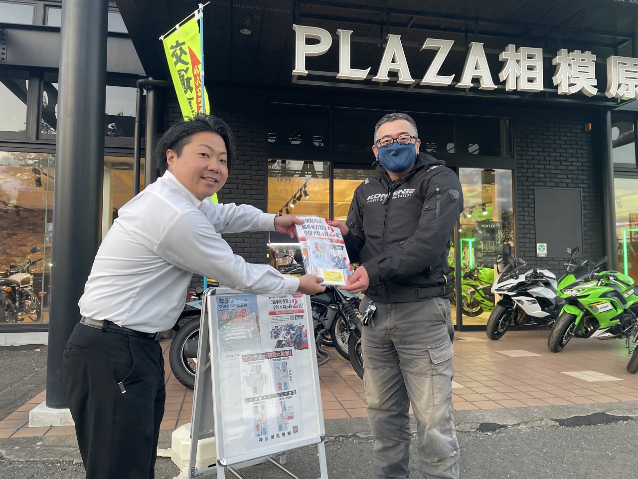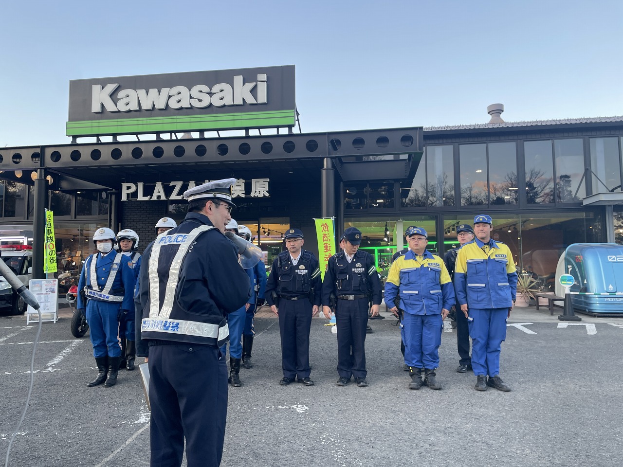 こんにちは、カワサキプラザ相模原です。                                  本日12月12日金曜日に「相模原南警察署」様ご協力のもと安全運転推進活動を行いました。            相模原南警察署長様にも店頭にお越しいただきました。
