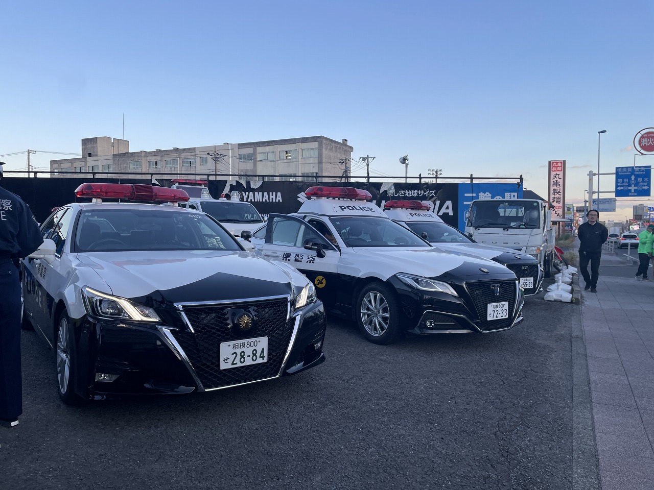 警察車両が複数台集結し一斉に走ることで周りの走行しております車両に