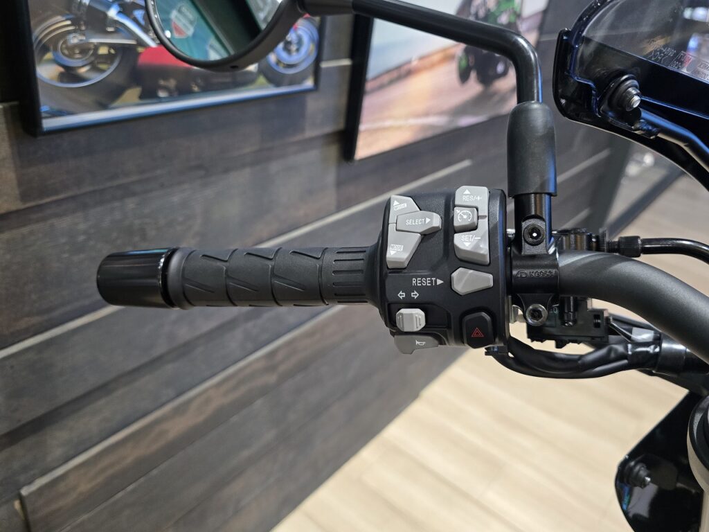 クルーズコントロールは設定した一定の速度で走ることが出来る機能です。スロットルを自分でひねっておく必要がありませんので、ロングツーリングをされる方には恩恵があります。レーダー付きではないので前車に追従する機能はありませんのでご注意下さい。
