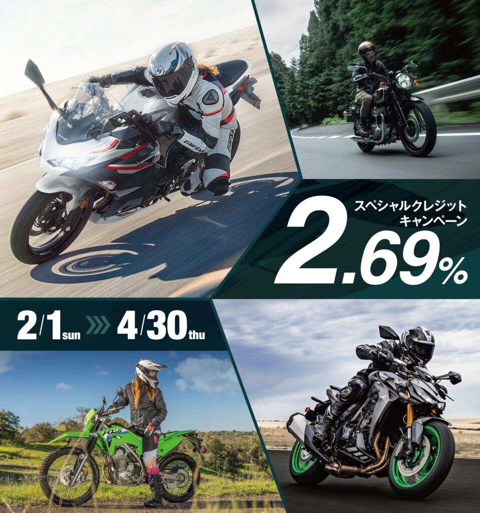 全国のカワサキ正規取扱店でカワサキモーターサイクル新車の購入時にご利用いただける、2.69%スペシャルクレジットキャンペーンをご用意いたしました。