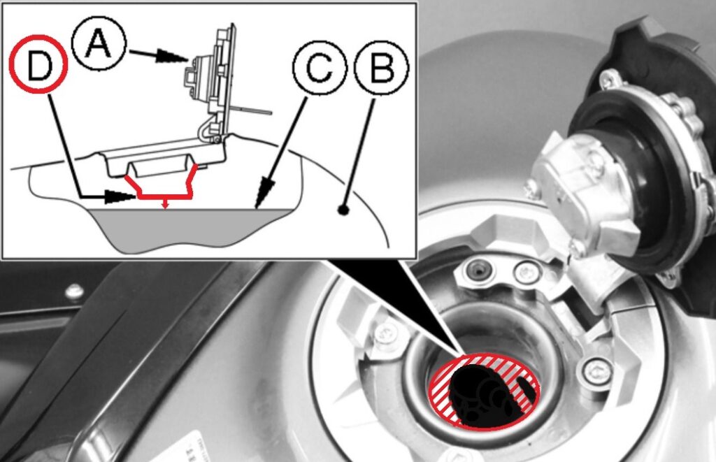 少量の燃料のオーバーフローに関してはタンクキャップのふちにある抜け穴から流れ