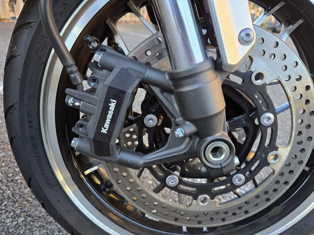 マニアックな違いですが、CB1000Fの方がディスク径が10mm大きくなっています。Z900RSが300mmに対してCB1000Fは310mmのサイズのものを採用しています。径が大きいのでスポーティーかと思いきや、さらにマニアックなところですがディスクの厚さはCB1000Fが4.5mm、Z900RSは5mmです。リッタークラスの大型バイクは一般的に5mm~5.5mmですので、CBは少し薄めです。摩擦で熱を帯びるディスクですが、厚い方が熱容量が大きいので、厚みで見るとZの方がスポーティーといえるかもしれません。ちなみにリアディスクはZの方が10mm大きいサイズを採用しています。